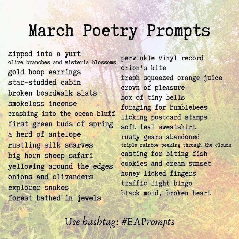 zipped into a yurt olive branches and wisteria blossoms gold hoop earrings star-studded cabin broken boardwalk slats smokeless incense crashing into the ocean bluff first green buds of spring a herd of antelope rustling silk scarves big horn sheep safari yellowing around the edges onions and olivanders explorer snakes forest bathed in jewels perwinkle vinyl record orion’s kite fresh squeezed orange juice crown of pleasure box of tiny bells foraging for bumblebees licking postcard stamps soft teal sweatshirt rusty gears abandoned triple rainbow peeking through the clouds casting for biting fish cookies and cream sunset honey licked fingers traffic light bingo black mold, broken heart