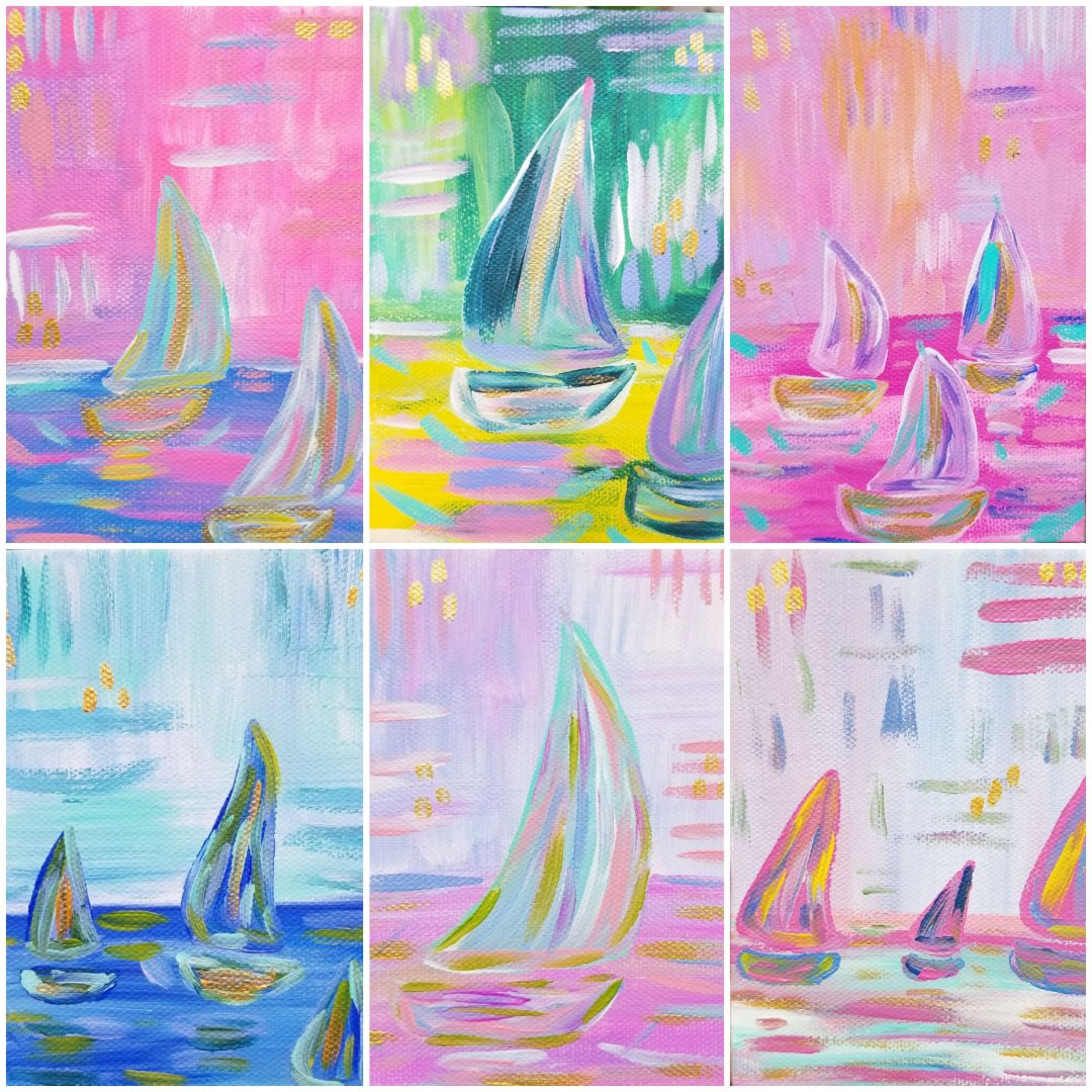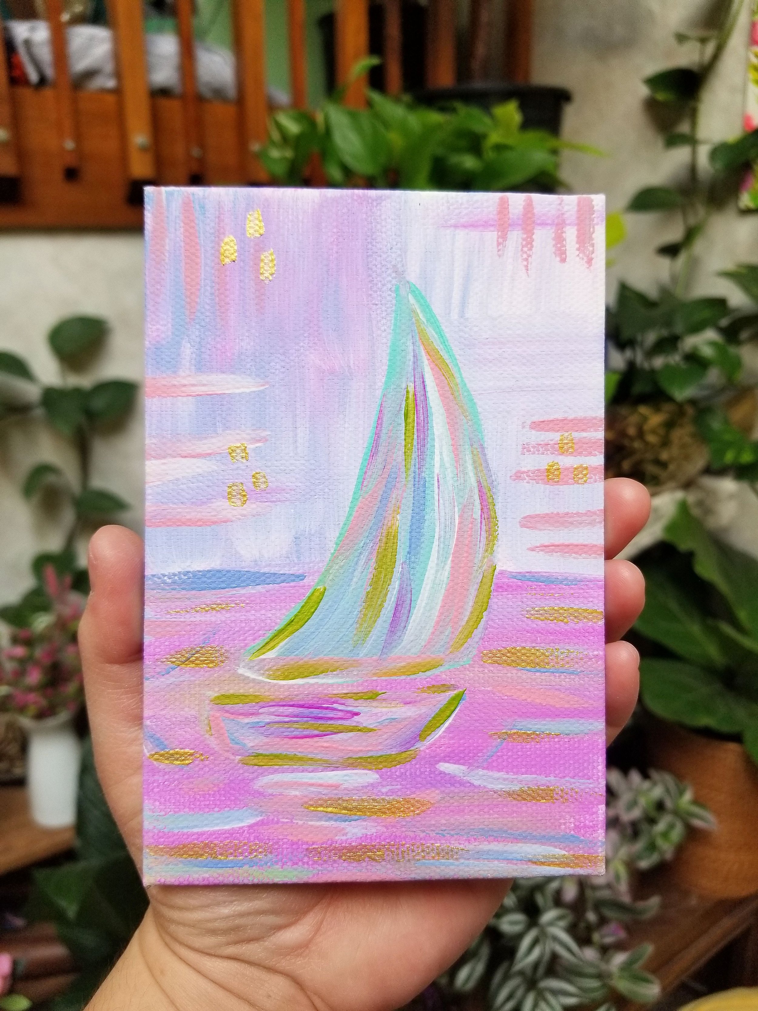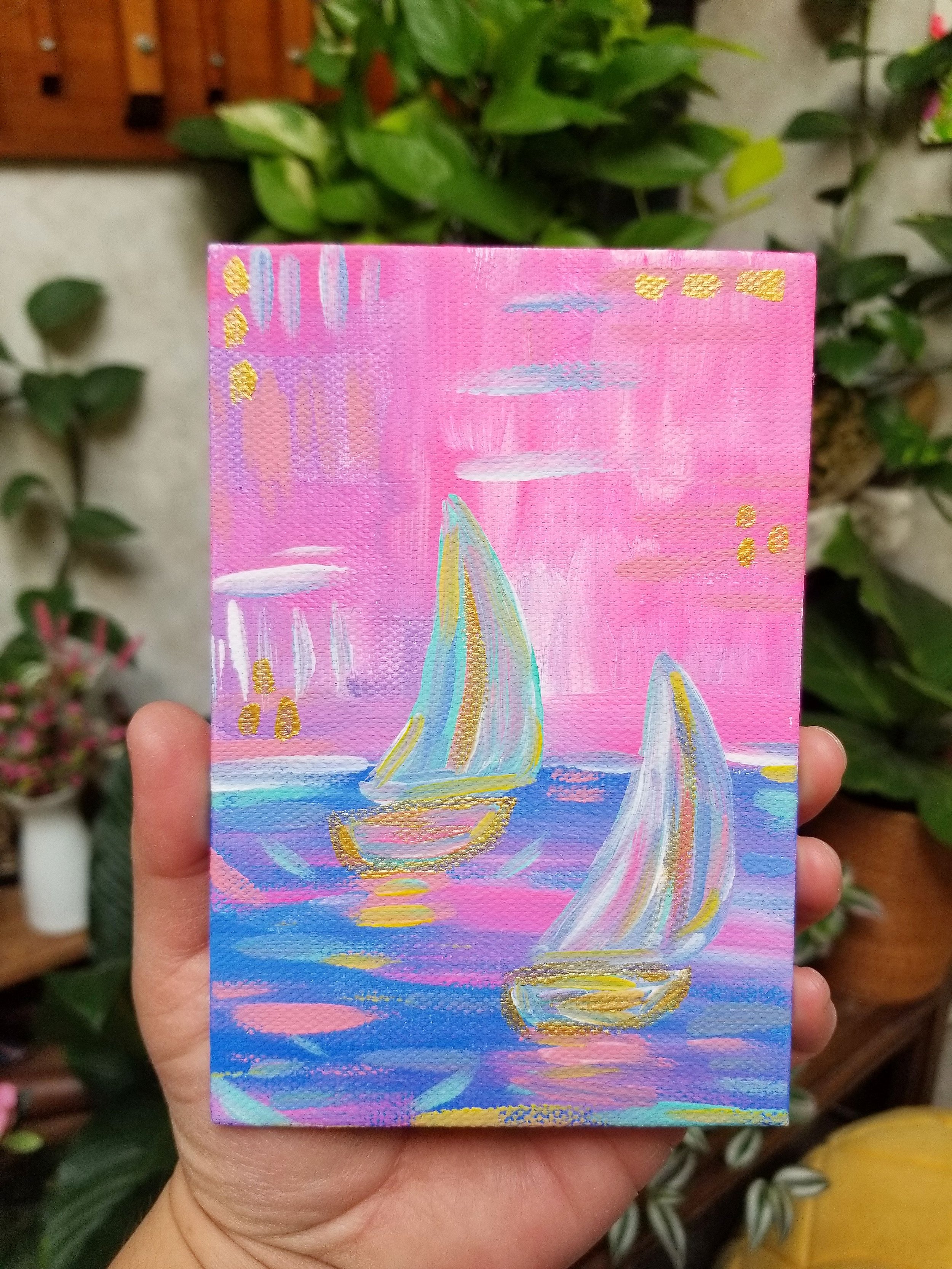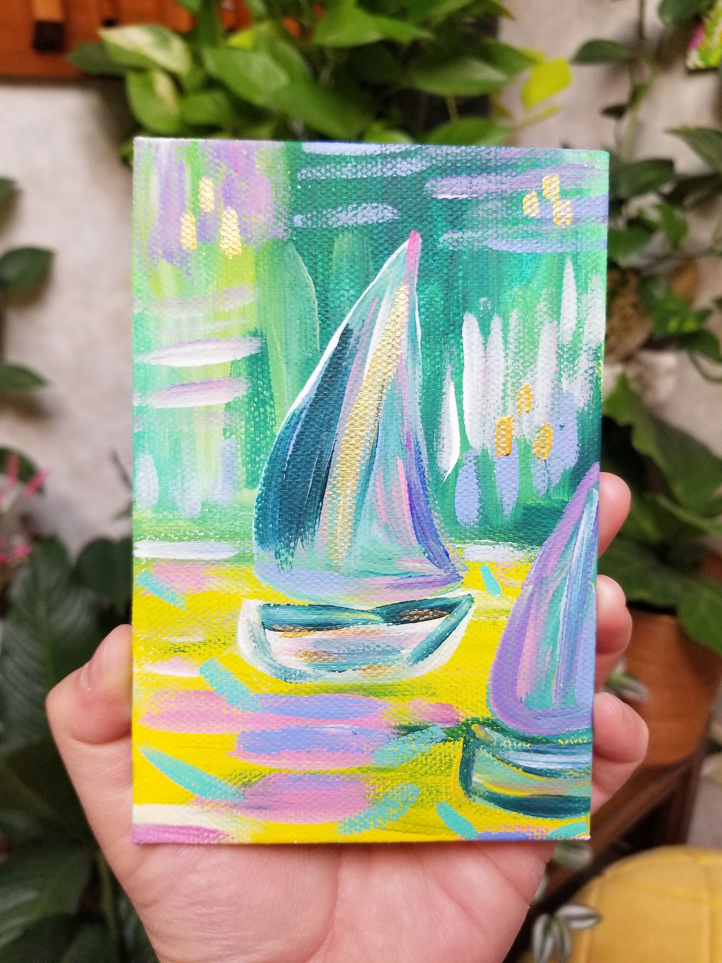 Small little sailboats in the harbor, in acrylic on canvas – all shine with hints of gold in the light!