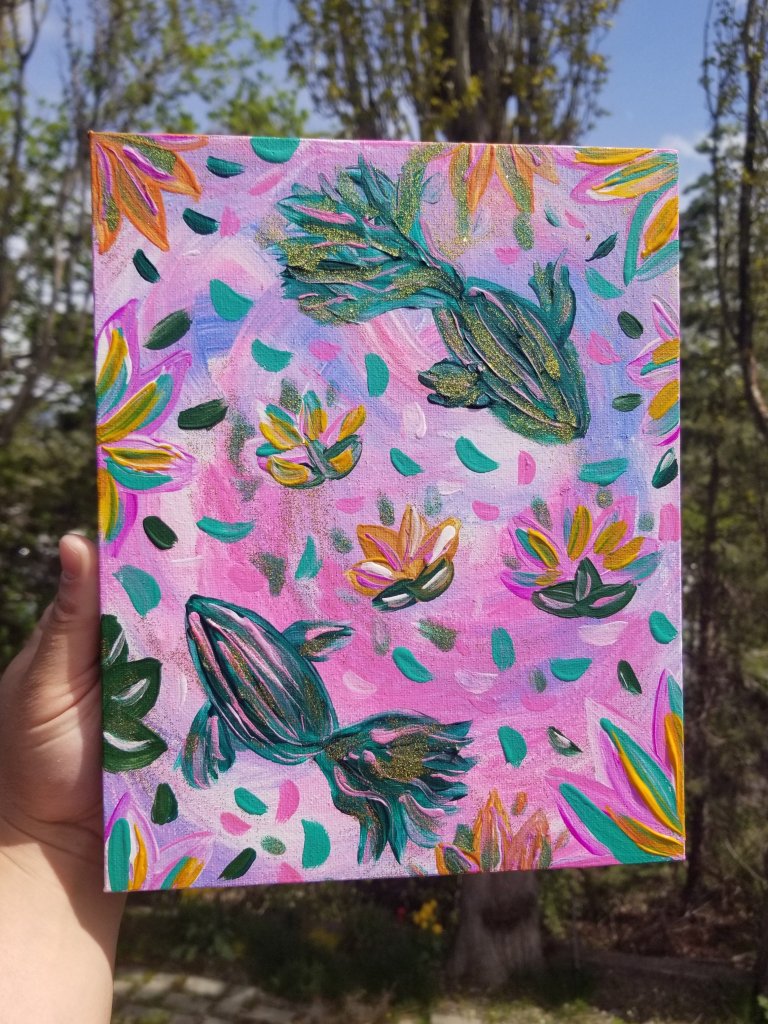 Learn to paint this fun and glittery koi fish friend in less than an hour – you’ll learn about creating a chaos layer background, layering colors and creating a swimming and fast water movement effect using acrylic paint.
